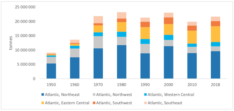Seafood production in the Atlantic went from an estimated 9 million tons in 1950 to more than 23 million tons in 1980 and 2000, and 22 million tons in 2018. This overall production has remained stable since 1970.