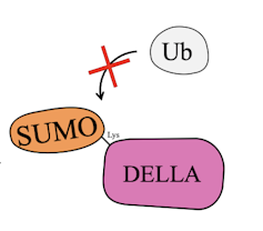This requires the DELLA proteins to be labelled in another way, through a cousin of ubiquitin, which scientists have named SUMO. SUMO replaces ubiquitin, and serves as a life buoy so that it does not get degraded.