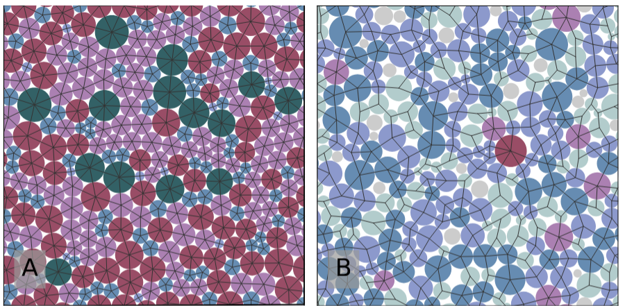 Starting with randomly placed polydisperse disks (varied sizes to prevent crystallization) in a square box, they minimize energy while allowing radii to adjust under constraints that preserve the overall size distribution. This creates nearly fully connected networks. They then enforce a complete “triangulated” contact graph—every space filled with triangles—using geometric tools like the circle packing theorem and a Lagrangian constraint system. The result: a disordered packing with every disk touching six neighbors on average, no gaps, and tiny overlaps.