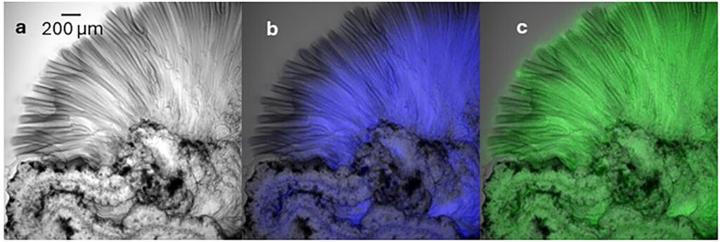 By using pH-sensitive dyes that glow different colors based on the local acidity, the team was able to visualize how these gradients shift during growth. They observed that the acidity is most intense (lowest pH) at the base of the tube where fresh metal ions are released from the dissolving salt, with pH rising toward the growing tip (often reaching above 5.9). Simultaneously, they used microscopic particles to track the “solution flow,” which is the movement of the liquid itself. They found that the flow is not just a simple upward push. Instead, it is a complex interplay between osmotic pressure (which draws water inward, building pressure that pushes the internal fluid out) and buoyancy (which pulls the lighter, acidic fluid upward), including circulation patterns that pump acidic solution toward active growth sites.