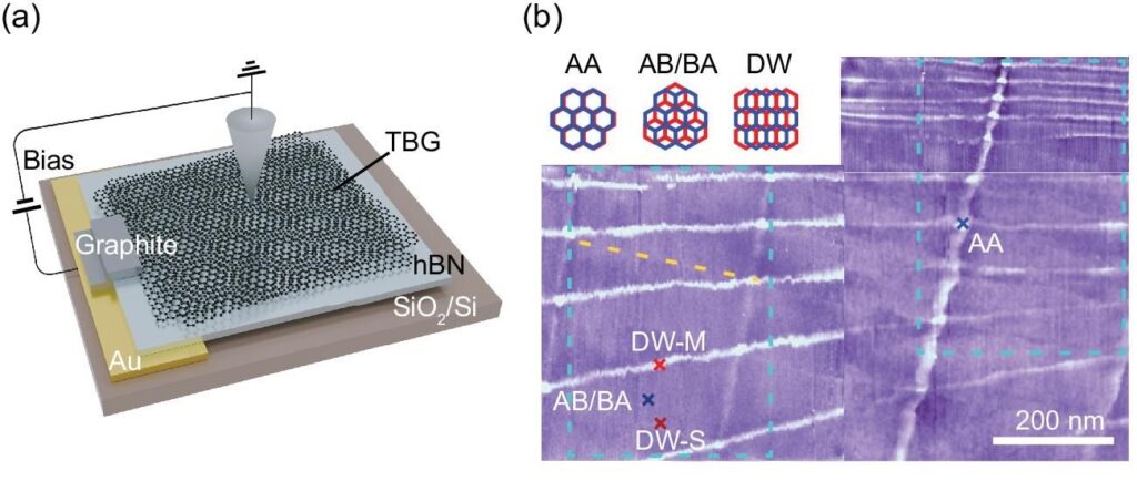 One of the most striking findings of this study is that not all domain wall boundaries are the same. Depending on how the graphene layers are strained during fabrication, two distinct types of boundary form: one dominated by shear (a sliding-type deformation) and one that combines shear with stretching. Each type leaves a different fingerprint in the local electronic spectrum measured by the microscope, almost like a barcode that identifies which kind of strain is present. This is precisely what the paper’s title means by “electronic signatures”: measurable, distinct signals that betray the underlying mechanical state of the material.